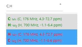 Each option in the list presents a possible mapping of axes specific to the selected experiment type (e.g. 13C-HSQC) to dimensions in the uploaded spectrum. Options printed in green are more likely to be correct than the red options. Each option contains a list of axes in the following format: